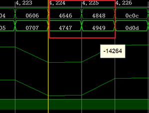 第265点符号位错误,我修改数据之后,底噪就睡降下去,有效位就上来了,我又看了其他几组有效位降低的数据,都出现了错点(有的是符号位,有的是整个点就错了),于是我怀疑要么采样出错,要么传输出错。于是我用ramp test mode测试,也出现了错点: