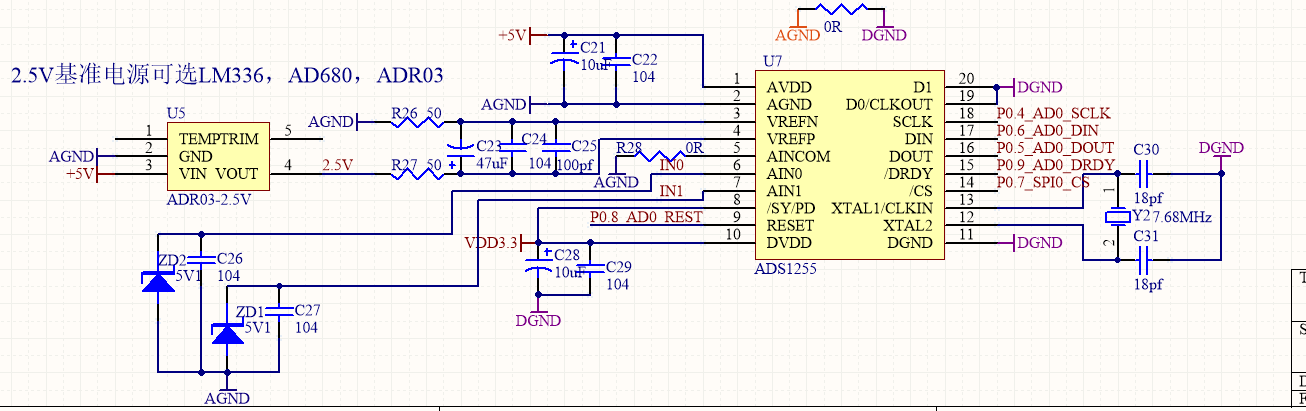 电路就是一个恒流源经过一个电阻,转换为电压信号后直接输入到ADS1255中。然后IN1就是一个恒流源连了一个电阻,电压值直接输入进来。ADS1255的参考电压的纹波已经测试过了,30uV左右。跳动就是在38-39mV左右,然后我们经过排查发现是在Ain1接入以后,我们还加了一个0.1uF的电容接地,本来是想滤波,但最后发现它好像在这一点对AD产生了影响,具体原因,你们可以帮忙分析一下吗?