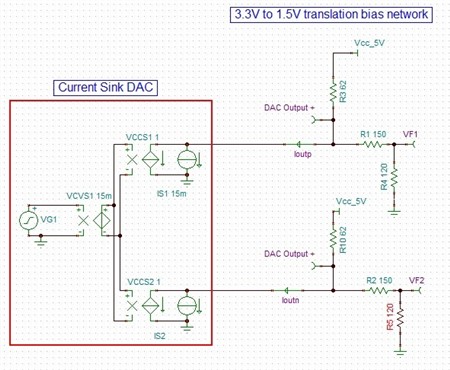 专家,你们好,我用到DAC5670这个芯片,但对后端网络连接方式一直存在疑虑,我需要后端差分输出接调制芯片,不知道是否需要变压器和功率放大器,若用麻烦推荐一款芯片。如果不需要,那后端如何连接到差分输入的调制芯片?(我需要DAC输出的频率要达到600MHz信号无衰减)下图是我连接示意图,VF1,VF2直接接到后端调制模块,要求差分输出摆幅Vpp在1.6V左右 ,不知这这种方案知否可行或最优,如果后端要加差分运算放大器,该选何种型号?请专家们给予指,万分感谢正!