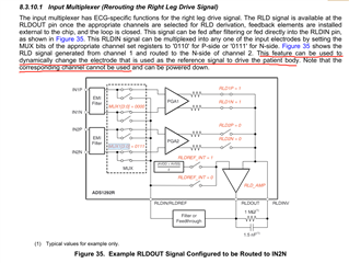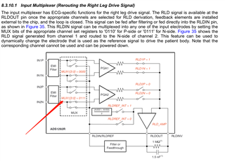 在使用ADS1292R做肌电信号采集的时候,需要使用其内部集成的RLD驱动电路,根据规格书8.3.10.1部分的内容提到,RLD电路可以通过配置ChnSel寄存器Mux【3:0】,Reroute到任意通道的任意输入端,但是后面又提到,相应的通道无法使用且可以掉电,请问这里该如何理解?是不是说假如我的RLD电路的RLDIN引脚如果Reroute到CH1通道的P输入端,那么这个情况下,CH1通道就不可以再用于输入的肌电信号采集了,只能用CH2通道?那这样的话,CH2通道用作采集时,如果RLD电路不route到CH2的某个输入端的话,是怎么做到抑制CH2的共模信号的?第二个问题见右下图红色标注字体,烦请一并解惑,谢谢。