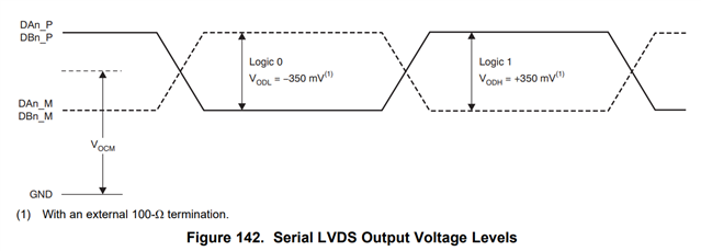 另外一款ADC3441,输出标准为LVDS,VOCM=1.05V,VODH=280~-280mV,VODL=-460~460mV,它的VOD的范围是多少呢?是否超过标准LVDS的电压标准了?可以直接连接其他LVDS标准的接口吗?
