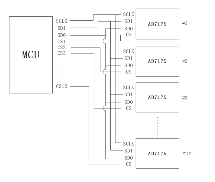 以前设计过12个AD7175同步采集 方案是公用SCLK、DIN、DOUT 不同GPIO控制不同ADC的CS 是没问题的因为DOUT是三态输出、CS高电平失能情况下为高阻状态 测试12个DOUT并联是可以正常使用的