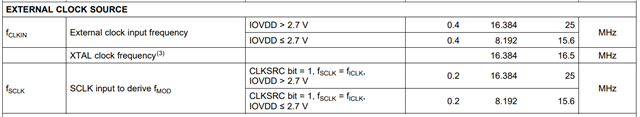 您好,SPI clock的时钟源位84Mhz,超出了datasheet中给出的频率范围呢。IOVDD>2.7V时, SCLK最大频率为25Mhz。小于2.7V时,最大为15.6Mhz。