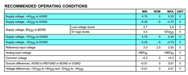 不可以的,查看数据表推荐的工作条件,, –AVDD to AGND 的范围是–5.25 ~ –4.75,不能将–AVDD接0V; -DVDD类似。