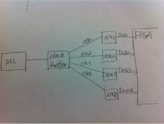 我目前采样板上有4个ADC(ADC083000), 他们都工作在3G采样上,输入时钟由同一个clock buffer 提供。 现在要将4个ADC同步以便使得4个ADC输出的时钟Dckl同步(或者说上升沿在同时刻产生)。 按照datasheet上说,可以使用CLK_RST信号同步,有时序要求如下: