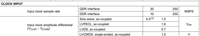 您好,CLKIN不一定必须是LVDS输入。datasheet中给出了几种不同的输入以及差分输入范围,可以是正弦波输入,Vid=Vclkp-Vclkn=1.5Vpp。或者也可以是LVPECL,LVDS或LVCMOS输入都可以。ADS42LB49需要250Mhz的时钟,所以FPGA输出250Mhz的话,divider配置为1,如果输入是500Mhz的话,divider需要配置为2.同样1G输入的话,divider 需要配置为4。 您这里提到100Mhz给CLK能正常工作是吗?