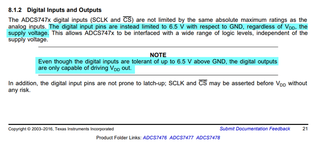 in datasheet discription, adcs7476 digital input voltage is independent with avdd,