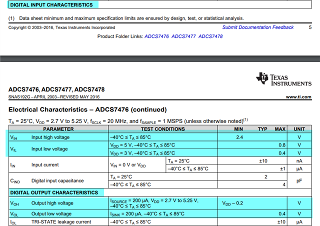ADCS7476: ADCS7476 digital input is independent with AVDD