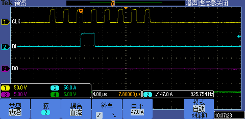 附件为在读第一个寄存器(BCS)时的波形 ,在DOUT上没有发现读取数据的波形。