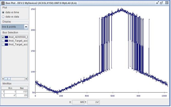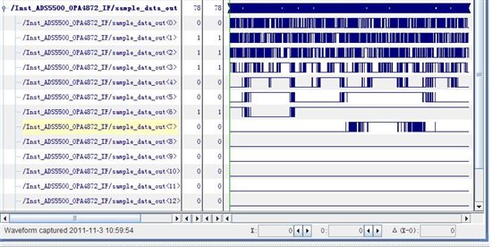 我们通过差分运放给ADC(ADS5500)输入了一个0~20mV的三角波信号,然后用逻辑分析仪输出的数据,发现在峰值部分有一个上抬,分析后发现是由于D7的错误输出导致,如果将输入信号加大,D8位也会出现错误输出的现象,ADC的输入端没有看到干扰,并且这类错误似乎仅仅与输入信号的幅度相关,而与输入信号的频率无关。