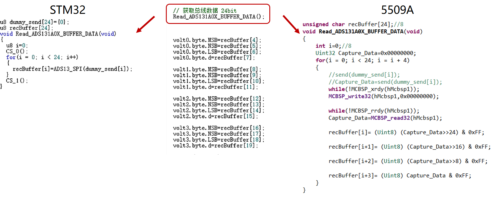 5509A和stm32控制ADS131A04时,ADS均处于异步中断模式,因此读取数据的方式理论上应该是相同的。其中5509A的程序是仿照stm32写的,如下所示,stm32发送24次8位的0,dsp发送6次32位的0: