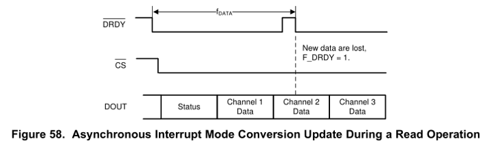 因此我想确认一下我的做法是否有问题。根据ADS131A04用户手册对其异步中断模式的描述(Figure 58),当DRDY信号变化时AD转换数据开始传输: