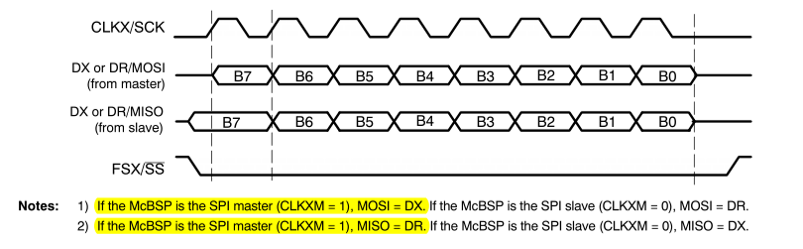 因此,根据Mcbsp配置为SPI后的时序图(如下,spru592E,Figure 6−3),我只用提供5×32个时钟信号就能完整地接收到数据,因此我在程序中进入中断后发送了5次32位的0x00000000。