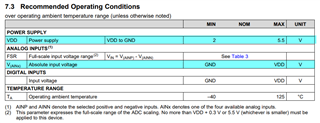 如果您的电压检测范围是 0~5 V,那么 ADS1118的供电电压必须≥5V,因为输入电压范围还受其电气特性的限制,即V(AINx)  Absolute input voltage绝对输入电压不能超过VDD;