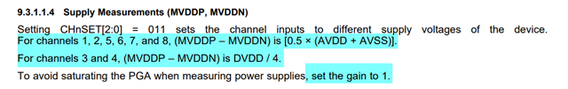 3.通道配置为MVDD for supply measurement。无论如何设置增益,所有通道读取到的值均向上达到满偏