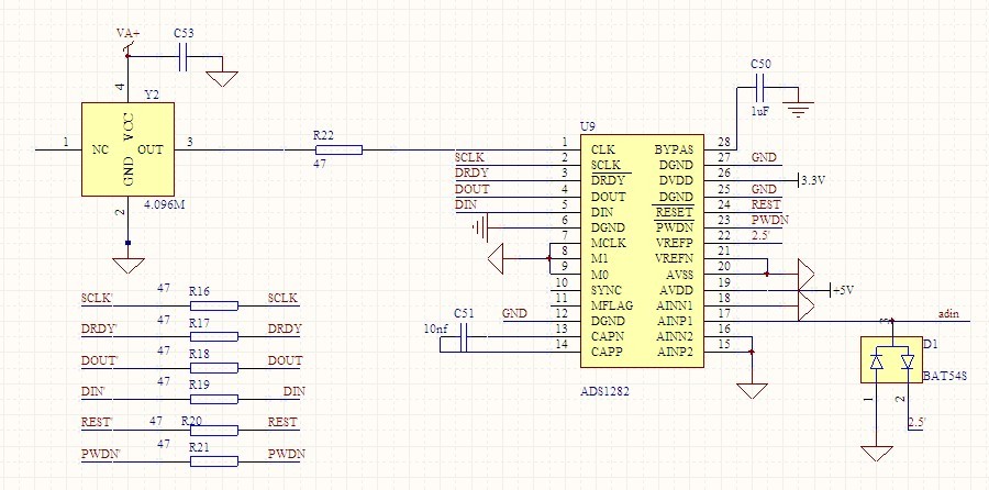 为了验证读写子程序正确,上电复位后读寄存器,读出的数据和寄存器默认值相同;配置完寄存器后,再读寄存器,数据配置正确。硬件电路:数字电压:+3.3V, 模拟电压:+5V; 参考电压: +2.5V。 (AD部分电路在附件里)