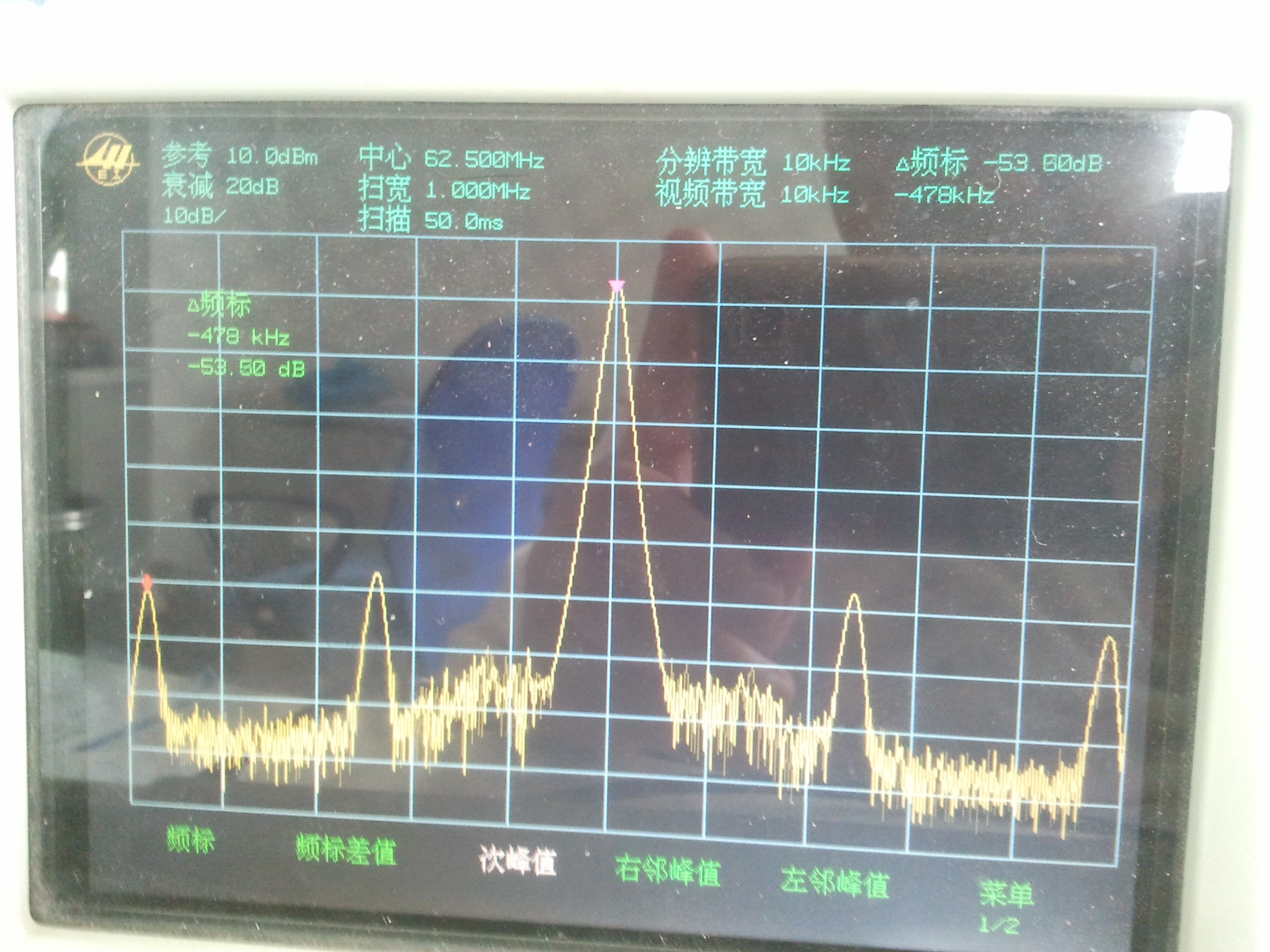现象:在62.5MHz信号附近每隔240KHz左右出现较大杂散信号,抑制在50dB左右,严重影响到后面的信号处理。