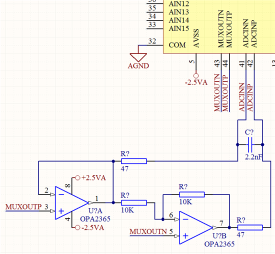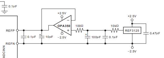 参考电源VREFP、VREFN电路参考ADS1258数据手册“Figure68.BridgeInput, Single-SupplyOperation”,选用REF3125+OPA350,