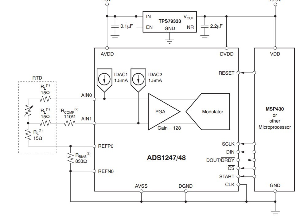我是按下面的原理图连接的,只是把RTD换成了一个120欧姆的定值电阻。寄存器配置写进去后,电阻两端能量到0.12V的电压。程序如下: