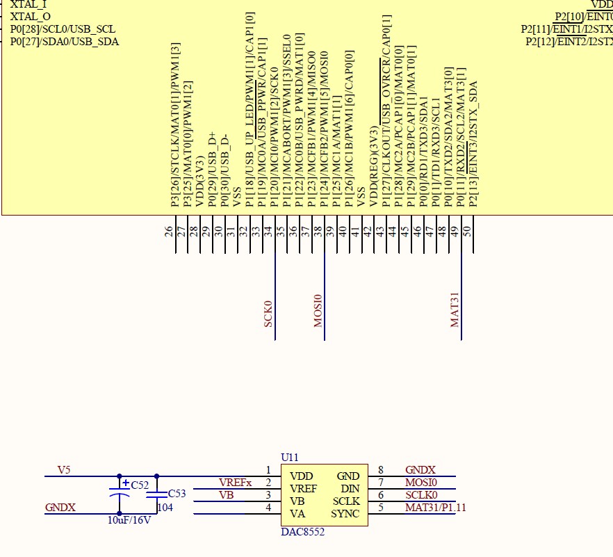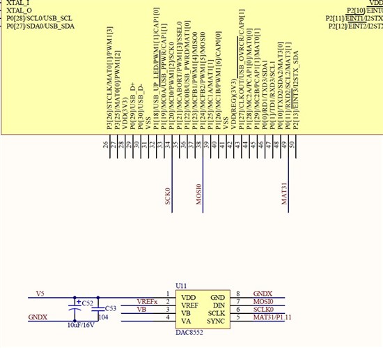 我使用的主控制器是NXP的LPC1768现在用的是片上兼容SPI接口的SSP控制寄存器来操作DAC8552芯片,但SPI或者是SSP有4根线(CS、MOSI、MISO、SCK),但现在DAC8552芯片只有三根线,请问主控制器的MISO引脚不接可以吗?应该怎么处理。我编写了程序始终也不能控制DAC8552