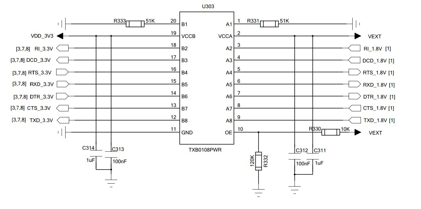 我这边使用TXB0108实现MCU-1.8V串口同SP3238-3.3V的电平转换。但是在MCU关机的情况下,VDD_3V3仍带电,结果就出现了TXD上报乱码的情况(PC端的串口工具观测到的),请问这个是什么原因造成的?