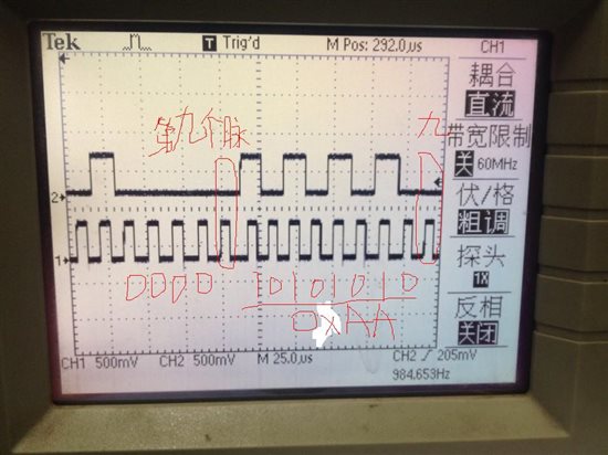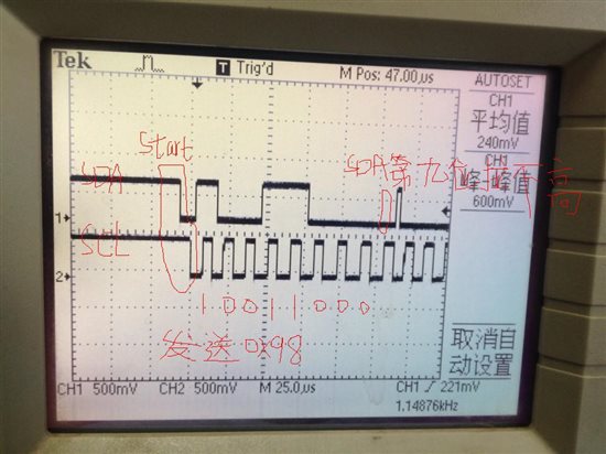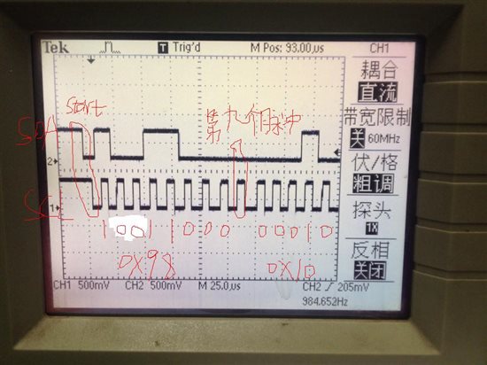 对于DAC8571的I2C通信问题始终无法解决(写入时序是这样的,开始、写入0x98、写入0x10、写入数据高位、写入数据低位、停止),就是说我发完DA芯片地址指令(1001 1000,即0x98)之后,接着应该在第九位将SDA拉高,等着DA芯片的应答,但是问题出现了,发现SDA无法拉高,后来经检查发现是由于DA芯片在第八个脉冲下降沿一到就立即就将SDA拉低了,导致单片机无法在第八个脉冲结束时将SDA拉起,当过了第九个脉冲之后,单片机就可以将SDA拉高了,这是什么原因呢?即使如此,如果我忽略这些,过了第九位之后,我接着发DA的控制指令(0x10),数据的高八位,低八位,转出的电压值也是不正确的,数字信号如图,