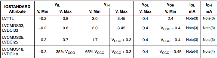 但一般我们用的微机芯片输出的1.8V LVCMOS电平都不在这个范围内,我们看到的这款器件的评估板原理图(NI 公司的BIG GIG REFERENCE BOARD REV. 2.0A)中是将这些控制信号直接与xilinx的FPGA XC4VLX15 的BANK IO直接相连,但从FPGA的参考手册中发现,1.8V LVCMOS电平并不能与之兼容,见下图。网上找到的一些电平转换芯片输出的1.8V电平也基本上是这个范围,这样一来,岂不是难有器件能够满足这款ADC的控制引脚电平要求了?另外上图中的(9)中说这个参数并未在产品中经过测试,我们不明白这意味着什么?
