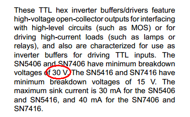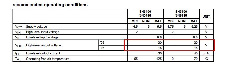 SN7406反相器数据手册上显示输出电压最大能达到30V
