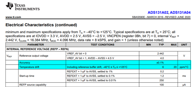 1、使用外部基准Vref 5V和内部4V基准,如果5V精度是0.05%,转换结果哪个更准?资料里没有写4V的精度 与温漂