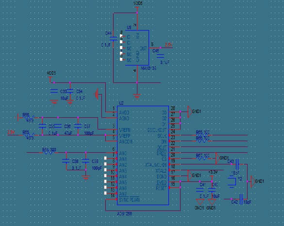 (2)Datesheet里面说的在测单端信号的时候不能把AINCOM接地(Page14),要接到某个固定已知电平,所以就把AINCOM接到49.9Ω那里了,是不是应该接到2.5V参考电压那里就可以了?