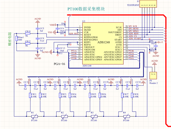 最近要使用ADS1248与PT100做测温实验,我想使用四路差分输入分别测四路PT100,共用一个基准电阻。下面是我用的四线法画的原理图,希望各位大神帮我看一下拿些地方需要改进的。谢谢