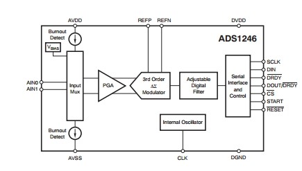 AIN1和AIN0每个输入不能为负值,但AIN1-AIN0可以为负值,范围是+/-(VREF/PGA)