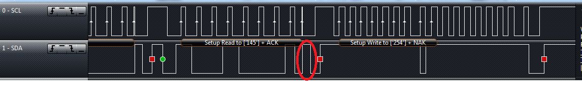 我用的是ADS1115,采集正电压工作正常,想来采集负电压,于是用差分输入,正常情况会输出补码,但是在补码开头,SDA总是在SCL高电平时出现上升沿,造成错误的停止信号,就是第二个红点,还有在红圈里的高电平,不知道是什么原因造成的,明明正电压时这些都没有,