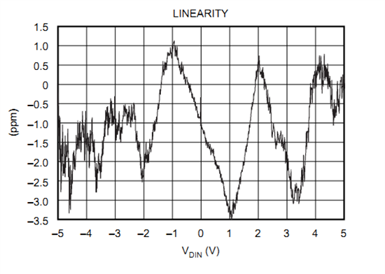 ADS1201的说明书中的增益非线性如下图所示,但是我用两台Fluke 5720提供了一对差分信号,实测出来的非线性却有100ppm左右(峰峰值),不知道为什么?