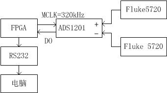 大概的测试逻辑如下图,使用两台校准仪5720提供两个2.5V的电压,然后改变两者的差值Vin,根据FPGA的计数来计算ADS1201的非线性