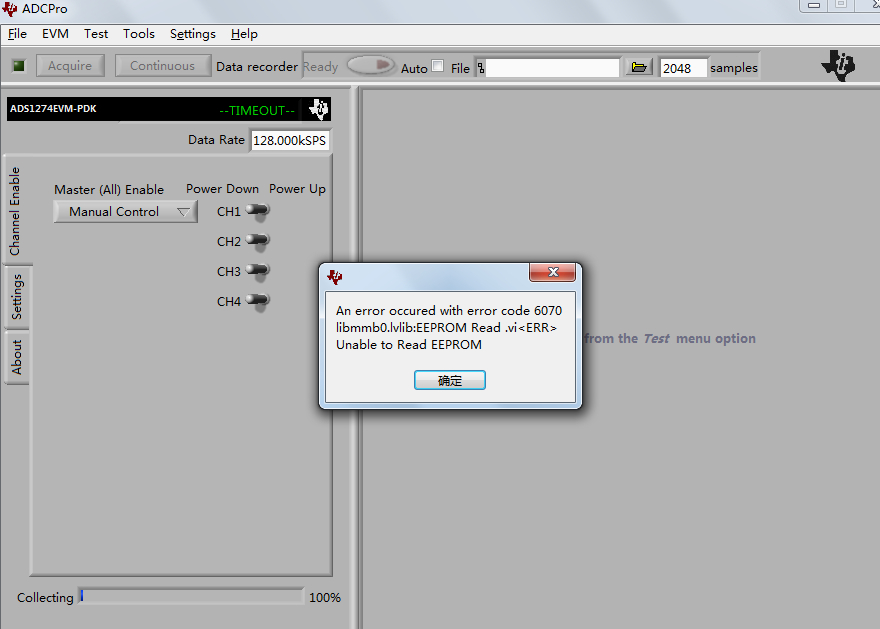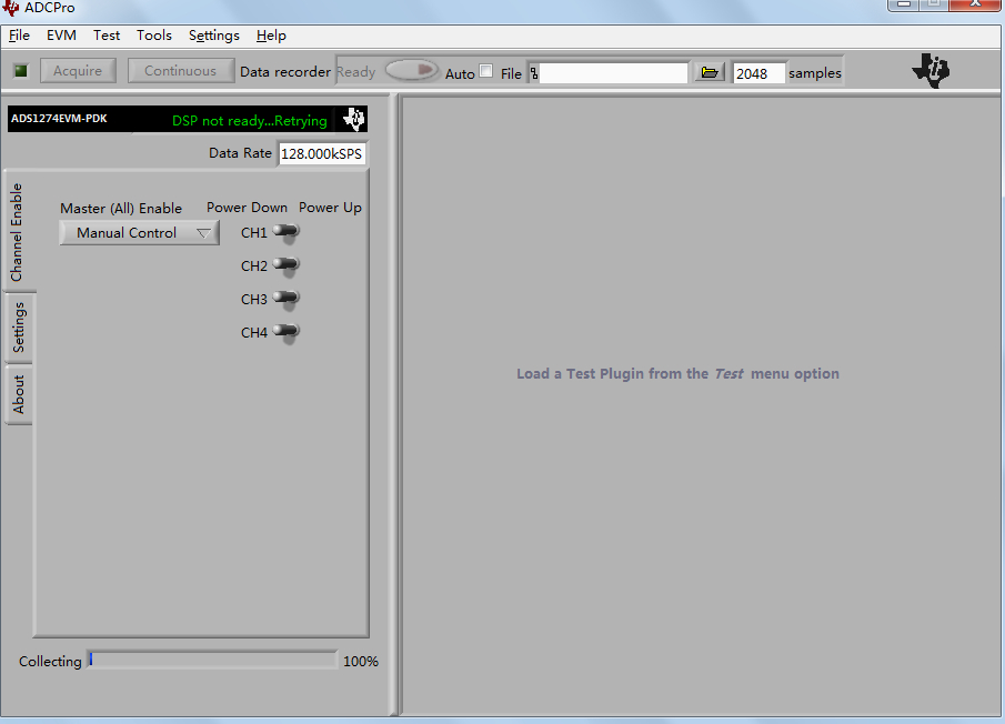 我在用ADCPro软件连接ADS1x7xEVM(我的是ads1274)开发模块时,连好电源线和USB线后加载1274evm plugin,软件显示一直停留在"DSP not ready...retrying"阶段,reset也没用。请问是什么原因?应该怎样解决?