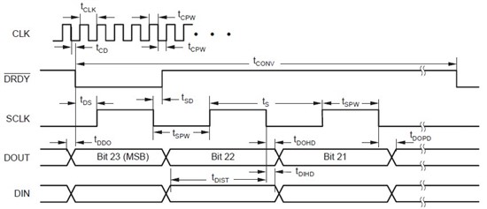 根据以上时序图,程序可以一直查询DRDY脚状态,查到低电平状态时即可读取数据,参考程序如下: