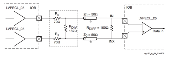 我们现在想用Xilinx Virtex-5 给它提供DAC 的DACCLK。v5 FPGA 可以输出是 供电电压为2.5V的LVPECL,请问能否按FPGA上给的连接方式与DAC3164的DACCLK管脚相连?