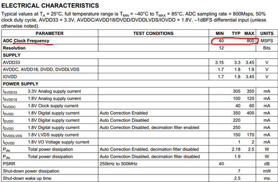 hi, 最近看ads5402 datasheet 发现一个问题,采样频率40~800Msps,输入时钟频率40~500MHz,采样频率不应该等于输入时钟频率么?为什么范围不一样?