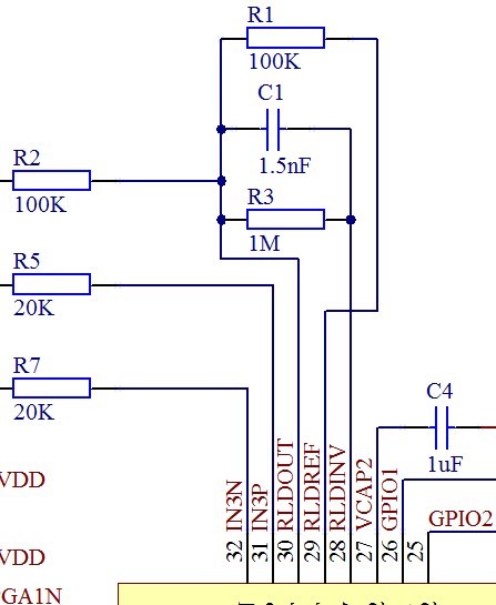 下图是我具体的电路连接。图中右腿驱信号由右腿驱动放大器输出后通过R2与人体连接。不知道是硬件连接错误还是寄存器配置错误,寻找芯片资料也没有相关的解答很是郁闷。