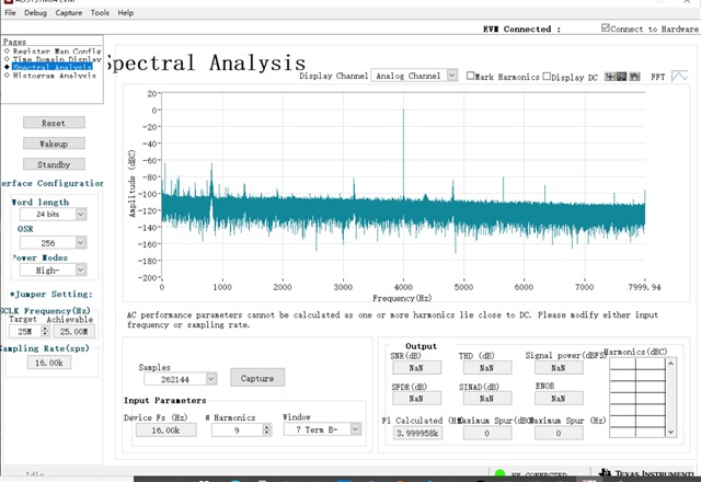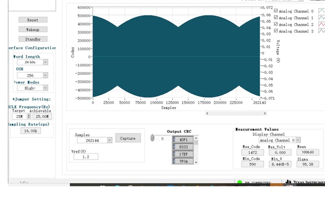 详情见如下图,板子是ads131m04EVM开发板,采用16k采样率,采集信号发生器生成的频率为4000的正弦波。