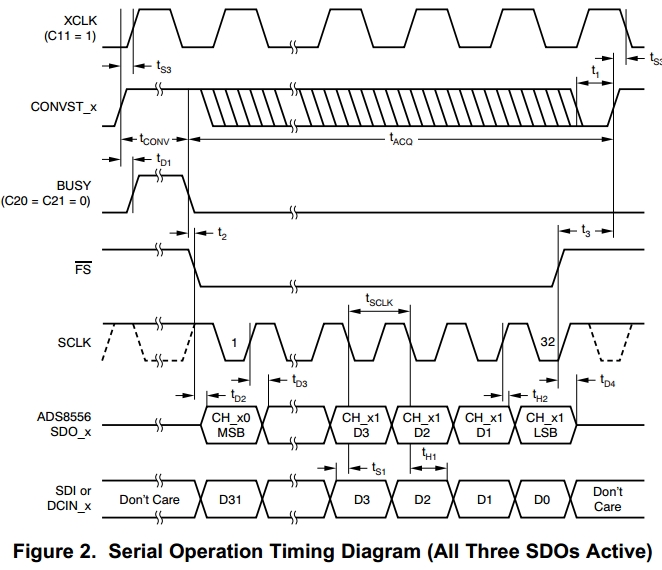 8556在串行模式下工作,查看数据手册得知,当SDO_A,SDO_B,SDO_C同时输出,最大速率可达450k sps;如果只有SDO_A,SDO_B输出时,速率最大为375k sps;如果只有SDO_A输出时,速率最大是 250k sps。显然这和串行输入时钟的频率相关。
