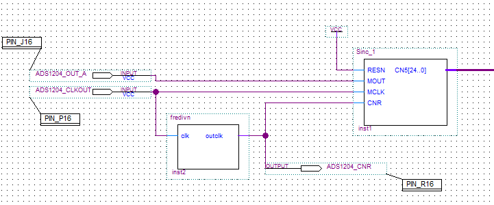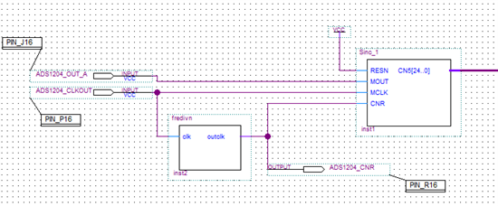 上图是我用vhdl语言在quartus 软件内绘制的针对ads1204的输出数据滤波模块,图中ADS1204_OUT_A 代表芯片的数据输出口,ADS1204_CLKOUT 代表芯片输出时钟,fredivn表示256分频即起到OSR=256的作用,sinc_1表示sinc3滤波。请问设计思路是否正确?我测试的结果是经过滤波后输出数据变化非常大,不知道问题出在哪里,请指教!
