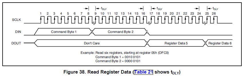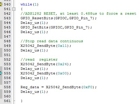 你好:我在用STM32F407的SPI操作ADS1282,我首先进行读寄存器测试,流程是:RESET PIn, 发送SDATAC命令,再发送0x24和0x00(读地址为0x04的寄存器值,它的RESET值为0x03),但是我读出的值却是零,麻烦您有空时帮我看一下,十分感谢!!