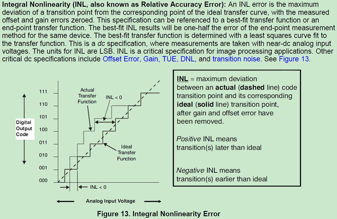 另外,INL是直流精度指标,并且增益误差和失调误差调零后,在直流或者非常低的频率条件下测量的,手册里面会给出INL的正负INL: