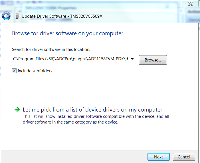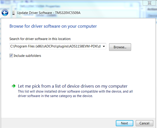因为驱动就在C:\Program Files (x86)\ADCPro\plugins\ADS1158EVM-PDK\driver 文件夹下,所以我尝试使用手动选择驱动位置: