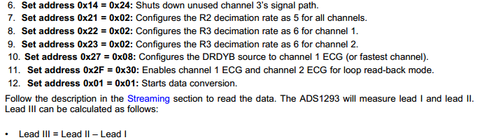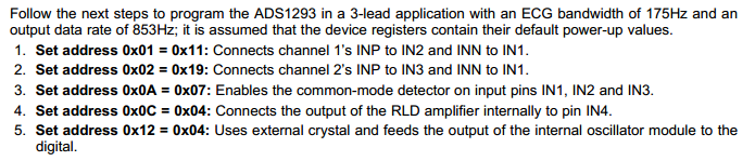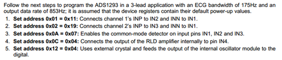 请问,5导联的ADS1293的寄存器中 ERROR-LOD等没有默认值的这些在初始化时应该设为什么?5导联的ADS1293在用DSP具体控制时需要进行哪些寄存器的控制,是直接初始化好了之后,除了两个芯片的SPI,寄存器这边只用0x01=0x01开始数据转换吗?