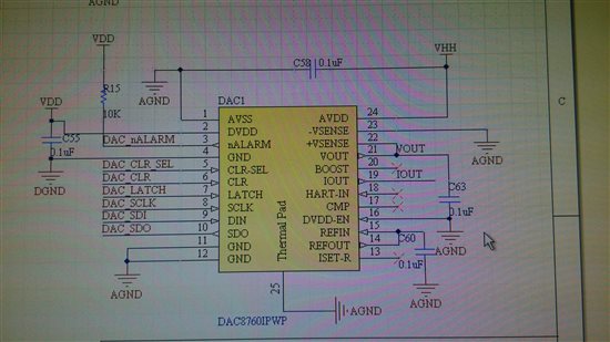 下图是我的原理图DAC部分,是否有问题? 我比较过此图和别人的电路图,发现一个可疑点在于,HART-IN管脚,人家的图是用一个22nF的电容连接在HART-IN管脚和地之间(前提是不用HART模式),我在设计中是悬空(因为软件上,我不设置为HART模式,而且此芯片初始值也是直流输出)。我后来试过用电容,但连接分别是1nF, 10nF和0.1uF的电容,但问题依然存在。