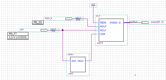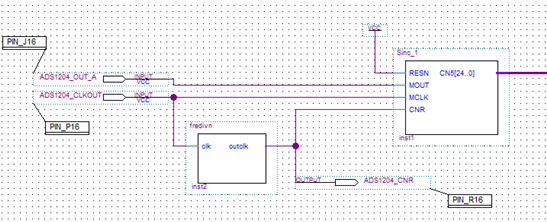 按照手册上说的,只要将CLKSEL设置为高电平就可以选用内部时钟,所以会有CLKOUT的周期为100ns,我将CLKOUT作为数字滤波器的时钟输入,再通过分频得到MCLK的输入,见下图的SINC3滤波器设计:(按照application note SBAA094中的思路设计滤波器,这是在ADS1204手册中提到的)