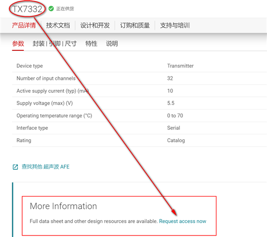 AFE5832 和TX7332 资料都不是公开的,都需要申请,网上资料的申请审批都是美国工程师负责的,建议您先在网上申请资料。